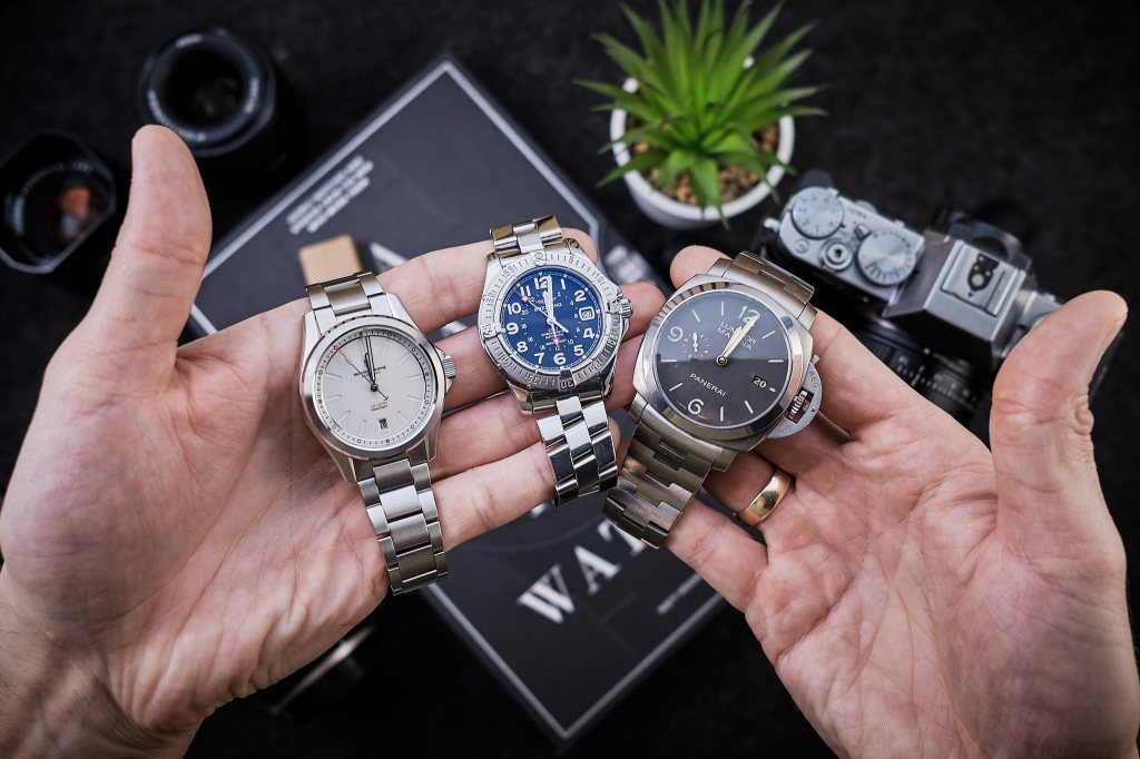 A na koniec, jeszcze korzystając z okazji zrobiłem ujęcie Panerai’a na bransolecie w towarzystwie innych akurat też na bransach siedzących zegarków z moich pudełek.