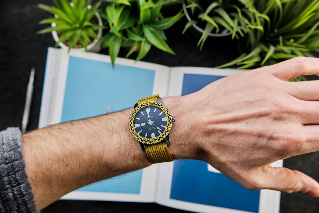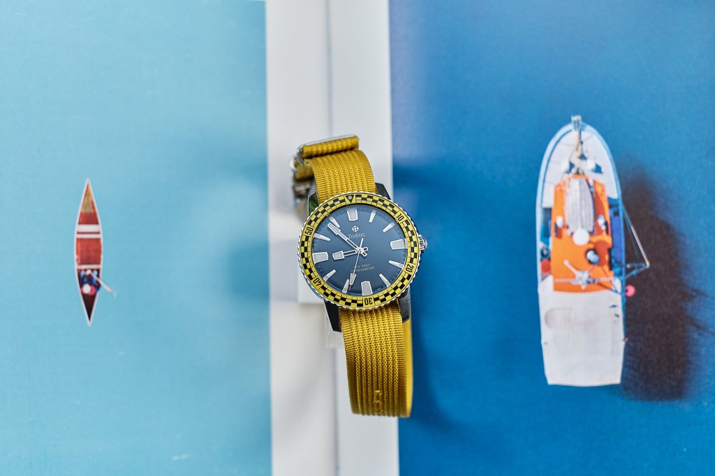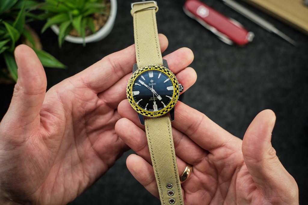 I to było pierwsze pozytywne zaskoczenie w tych przebierankach. Zyskał (jeszcze) bardziej wyluzowany charakter i pasował by mi tak do dnia na żaglach na przykład. Idąc tym tropem poszperałem też, w zasobach tak zwanych pasków NATO wydobywając przede wszystkim, nieco taki już totemiczny – musztardowy. Oj! Tak – ten bardzo ładnie zagadał z bezelem tego gagatka.